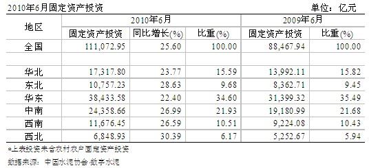 2010年1~6月份,城鎮(zhèn)固定資產(chǎn)投資額達(dá)111,073億元,同比增長25.6%,西北地區(qū)增長最快,同比增長30.39%。地區(qū)中,海南以41.2%的增速位居第1,廣西、寧夏、甘肅、湖北緊隨其后,增速都在36%以上。