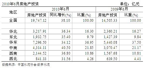 2010年1~6月份,房地產(chǎn)投資繼續(xù)保持穩(wěn)定,同比增長38.1%,與1~5月同比增速基本相當(dāng),其中中南地區(qū)增速最快,同比增長40.50%,華北增速有所放緩。地區(qū)中,海南、廣西、福建、河北增長超過50%。
