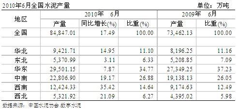 2010年1~6月份,水泥產(chǎn)量84,847萬噸,同比增長17.49%,主要受雨季提前影響,六大產(chǎn)區(qū)產(chǎn)量增速都有所放緩。地區(qū)中,海南、四川、湖北增速都超過40%,仍位居前列。